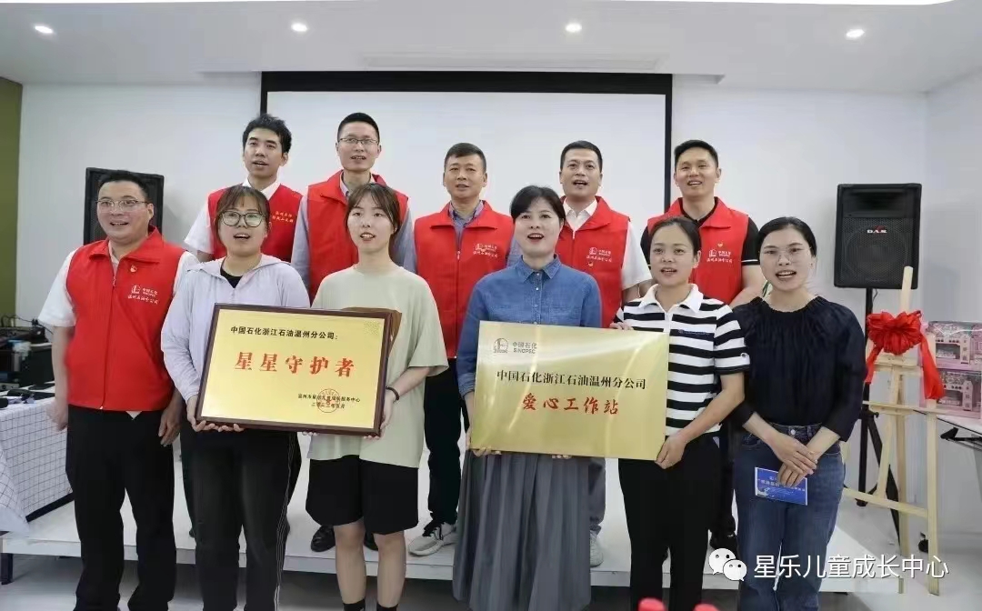 随后,共青团温州市委员会基层部李海鹏部长与中石化温州分公司徐冰书记共同为“爱心工作站”举行揭牌仪式,祝贺星乐成为温州石油分公司爱心工作站点。紧接着,星乐主任陈红芬也为温州石油分公司送上“星星守护者”、家长代表送上鲜花表示感谢。