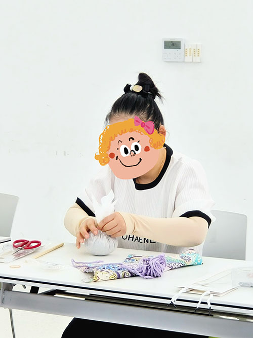家长们拿起材料,开始认真制作自己的艾草锤。她们将药香扑鼻的艾草压实、包裹,再用棉线层层缠绕定型,原本零散的材料在大家手中逐渐蜕变成古朴精致的艾草锤。现场气氛热烈而有序,每一个艾草锤都凝聚着长者的心血和创意。